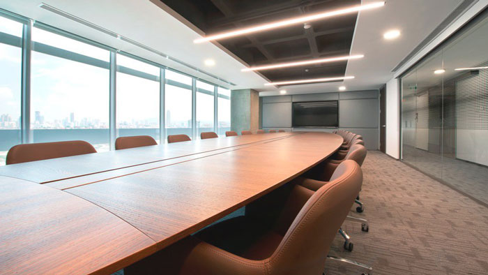 會議室的設(shè)計(jì):整個會議桌呈橢圓式分布,幾乎占據(jù)了整個空間的中心區(qū)域,這樣做也是為了滿足企業(yè)對于人數(shù)的需求,同時也是為了采用去中心的設(shè)計(jì)手法,在這樣的空間中思維與想法不會受到任何的阻隔,同時水景的引入,也給會議一種一往無前的暗示。