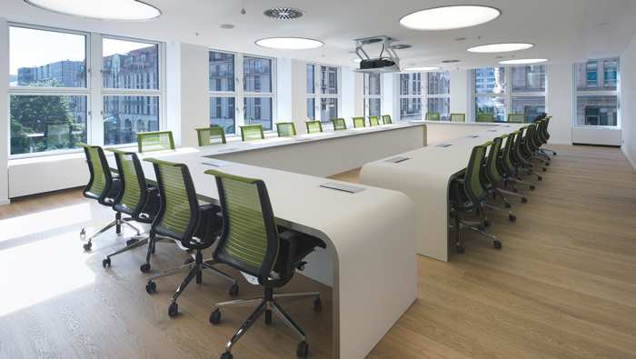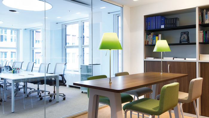 會(huì)議室的設(shè)計(jì):此處可以容納將近30個(gè)人,在這里開(kāi)放是空間的主旋律,在這里員工感受到的是一種輕快之感,這也是設(shè)計(jì)師希望看到的,在設(shè)計(jì)師看來(lái)一個(gè)輕快的會(huì)議空間,可以在無(wú)形中化解對(duì)于員工的壓力,讓員工可以在這里的空間中得以自由發(fā)揮。
