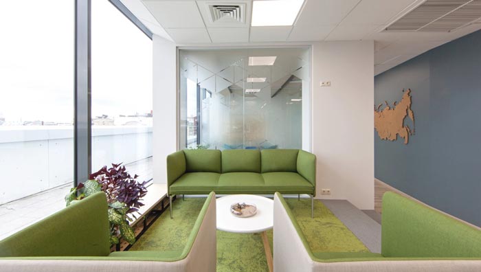 進門區域的設計:客戶進入后看到的一處生機勃勃的空間,這也這是設計師特意為之,在設計師看來不管是什么,第一印象都十分重要,故此設計師希望通過生機勃勃的進門區域,給客戶留下一個不錯的第一印象,同時生機勃勃也在一定程度上展示企業蓬勃發展的前景