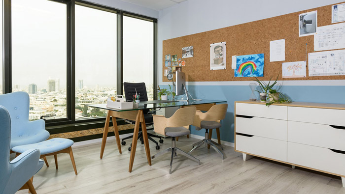 本次生物科技公司裝修設計效果圖講解到此結束,設計師在辦公室設計中,在色彩上以藍色、粉紅色、白色為空間主要色調,目的就是希望打造一個藝術化的簡約空間。