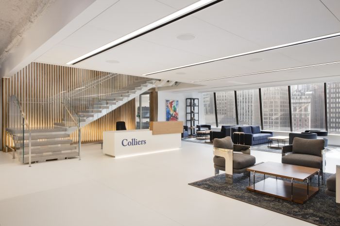這是一個5500方的辦公室,整體空間寬敞明亮。整個空間設(shè)計都凸出體現(xiàn)了公司的品牌,同時還采用了極簡主義的色調(diào)和紋理。大理石面板從電梯大廳一直延伸到白色、淺灰色和藍色的輕盈背景中。