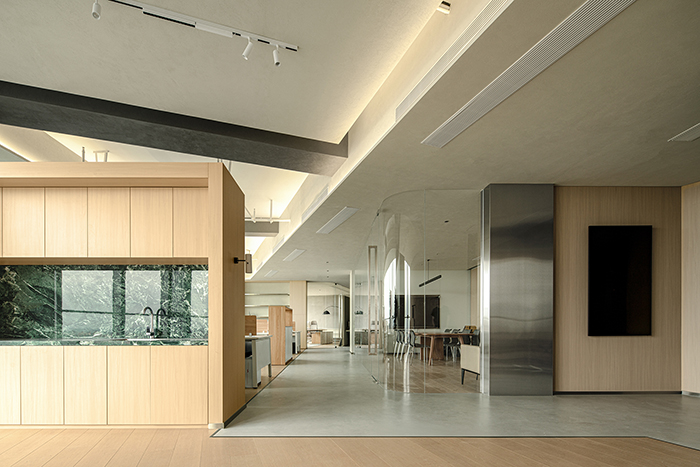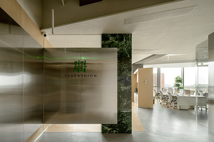 企業產品專注可持續性人工種植,主設計師對此表達為生態的感觀,提煉企業產品紗線最源頭的木材做為空間木飾面,同時希望在水泥墻面的深淺交錯的映襯。