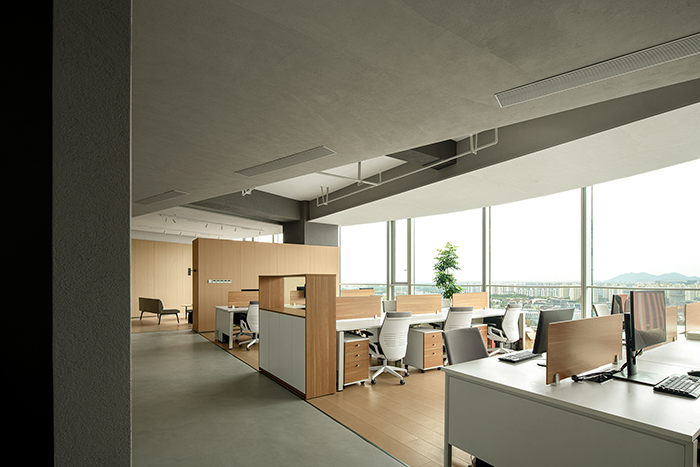 這是一個200m²的空間,場地是一個擁有圓弧玻璃落地窗的長方形空間,靠窗的一面可以看到遠處天際線的景觀。客戶期待的辦公環境是一個自然,舒適,大家庭般溫暖的空間,同時也要兼具辦公的高效與實用。