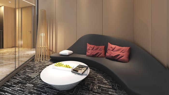 接待區(qū)域的設(shè)計(jì):在設(shè)計(jì)中不是每一個(gè)空間都是完美的,就像此處空間本身就是一個(gè)菱形,這也就為設(shè)計(jì)增加了難度,設(shè)計(jì)師首先用木飾面對(duì)墻體進(jìn)行裝飾,打消空間的棱角,其次就是定制的弧形接待沙發(fā),不管是擺放位置還是其本身的形態(tài),都有效的化解了空間本身的缺憾,讓空間趨于完美。