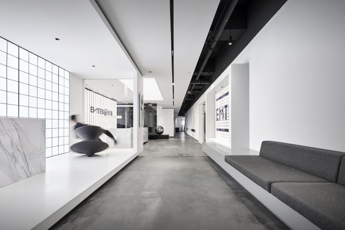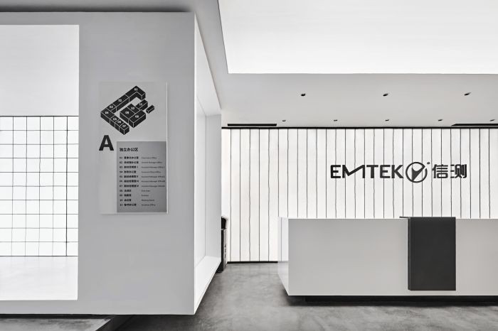 這是一個(gè)檢測科技公司辦公室的設(shè)計(jì),有1000方的面積。設(shè)計(jì)師在重新設(shè)計(jì)品牌空間時(shí),通過延續(xù)黑白灰的基調(diào),加入對立、沖突的元素,消解空間軸線的刻意規(guī)律感。