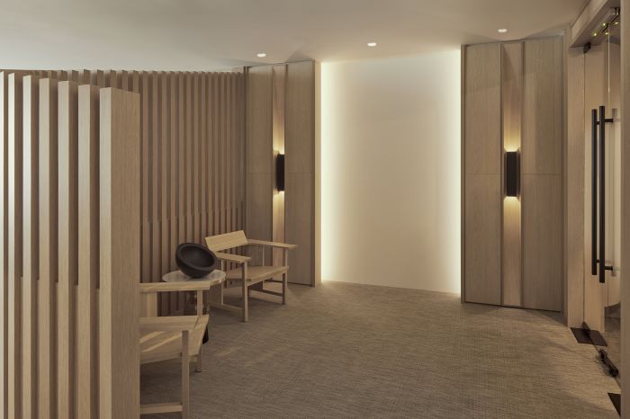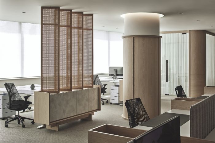 這是一個冷淡風的辦公室,辦公空間從入口到室內內部,每一個元素都給用戶提供了一種幸福和平靜的感覺。空間內部整體為開放式辦公室,區域或者隔間中使用百葉窗和藤條屏風進行分隔。