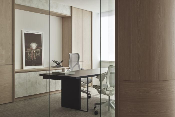 設計師選用天然灰燼木材使用統一的暖色調,并且把墻角磨圓,使辦公空間在視覺上感覺平靜而和諧。會議室中使用了柔軟半透明的窗簾讓辦公室整體充滿了家庭的寧靜感。