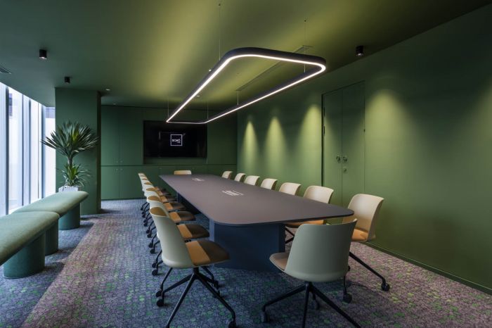 他們試圖打造一個能展現(xiàn)企業(yè)文化并能激發(fā)團(tuán)隊熱情的辦公場所。所以空間減少了實體隔墻,以展現(xiàn)開放的辦公文化。運用塊面色彩、幾何形式、通透的玻璃隔墻去界定各功能區(qū)域,形成沒有視覺阻隔的開敞空間感。這樣的設(shè)計也正好契合公司致力于互動與協(xié)作的工作精神。