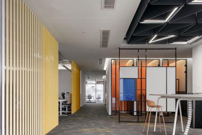 前臺空間使用了白色大理石材質(zhì),整體風格簡潔優(yōu)雅。空間右側(cè)使用企業(yè)的品牌色黃色和橙色設置了一個線條隔斷,用于分隔入口區(qū)域和辦公區(qū),保護企業(yè)辦公空間的隱私。空間讓來訪者感覺流暢現(xiàn)代,同時也充滿了企業(yè)的個性。
