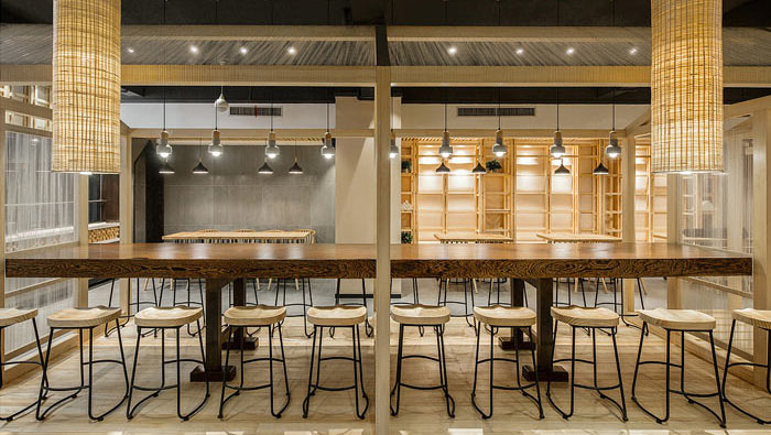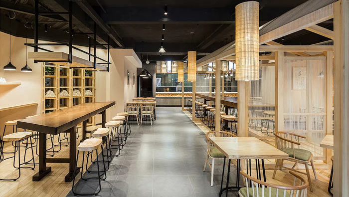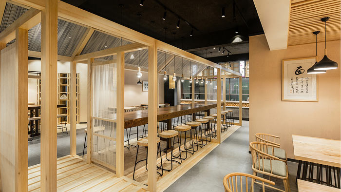 特色面館中間區域設計:中間區域由木制的框架構成,設計師在整體框架之下,又將空間分成幾個不同的區域,這樣做的目的就是希望將空間進行有效的劃分。
