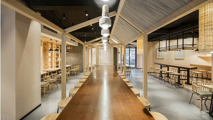 特色面館大眾區設計:超長的餐桌、獨立的餐椅讓空間的容納能力進一步提升,空間的容納能力提升但卻并不顯得擁擠,這是設計師為每個人都預留了足夠的活動空間。