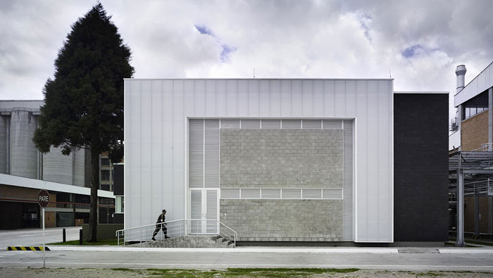 工廠廠房行政樓入口裝修設計:潔白的辦公樓外墻,給廠區不一樣的感覺,白色不易打理,設計師在設計中特意做了處理,目的就是希望白色可以長久保持,這也是廠區的一大亮點。