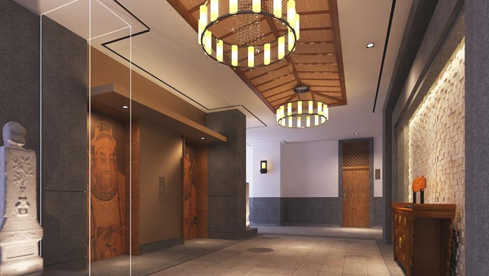 大廳的設計:顧客進入大廳之后,給人的第一感覺就是小溪流入百姓家的感覺,酒店的整體格局是回字形建筑,故此設計師在設計中,就充分發揮建筑本身的優勢,頂部銀河般的燈帶仿佛彩云一般,上頂彩云、下有小溪,給人營造一個生態化的自然氛圍。