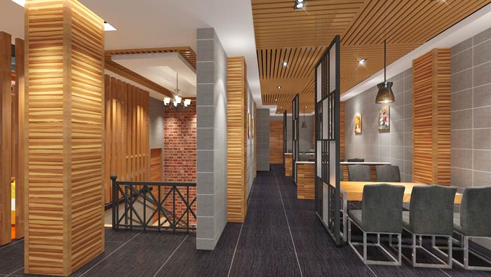 本次魚(yú)火鍋店裝修設(shè)計(jì)方案講解到此結(jié)束,設(shè)計(jì)師在本次火鍋店設(shè)計(jì)中,空間地面采用黑色仿古磚,墻面采用三種色彩的材質(zhì)與小紅磚,讓客戶仿佛在記憶中中老房子里就餐。