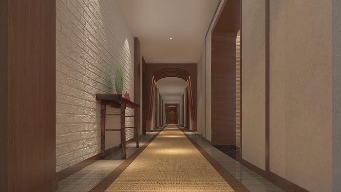 走廊的設(shè)計(jì):經(jīng)過(guò)前臺(tái)客戶通過(guò)走廊進(jìn)入客房,在空間的作用上走廊起到連接兩個(gè)空間的作用,這樣的空間給了設(shè)計(jì)師很大的發(fā)揮空間,首先就是地毯的設(shè)計(jì)與選擇,土黃色的地毯與深色的外延,讓人感受到貴賓一樣的待遇,好似古代達(dá)官貴人出行紅地毯鋪路的場(chǎng)景,同時(shí)在空間意境的感染下,讓客戶的心得以靜下來(lái),去聆聽(tīng)空間的故事。