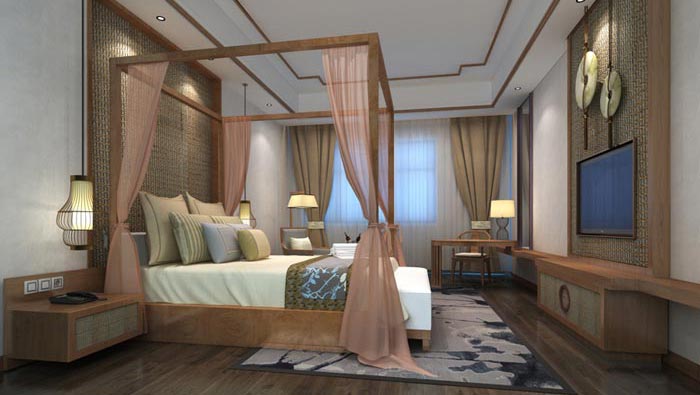 帳幔客房的設計:此客房最大的亮點就是帳幔,茶香古色的大床房與幾個別具特色中國元素配飾,在聚光燈的照耀下蕩漾著一種如蘭的靜雅,一種如蓮的婉約,更帶著一種濃郁的生活氣息,溫暖而藝術的家居環境讓人陶醉。