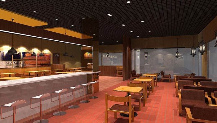 快餐店餐區裝修設計:暖色系的燈光、暖色系的色彩設計,給客戶一個穩定的就餐環境,這里沒有用桔紅色,是希望給客戶一個安定的環境,業主不希望因為色彩的刺激,造成客戶吃快食。