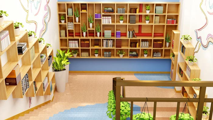 舞蹈培訓(xùn)機(jī)構(gòu)一樓前廳設(shè)計(jì):一樓前廳主要是圖書(shū)銷(xiāo)售、購(gòu)買(mǎi)與閱讀,在這里有著各式各樣的書(shū)籍,孩子們可以在這里閱讀,柜子的設(shè)計(jì),打破傳統(tǒng)的中規(guī)中矩,柜子中藏著休息區(qū)域,讓空間更有體驗(yàn)感。