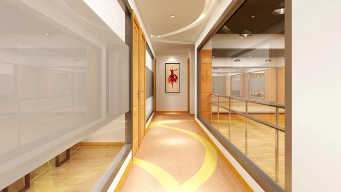 舞蹈培訓(xùn)機(jī)構(gòu)二樓過(guò)道設(shè)計(jì):二樓主要以舞蹈培訓(xùn)為主,過(guò)道地面地板膠和頂面造型設(shè)計(jì)相互呼應(yīng),這樣的設(shè)計(jì)既能保證空間的靈動(dòng),同時(shí)又能折射出一種孩童對(duì)未來(lái)的幻想。