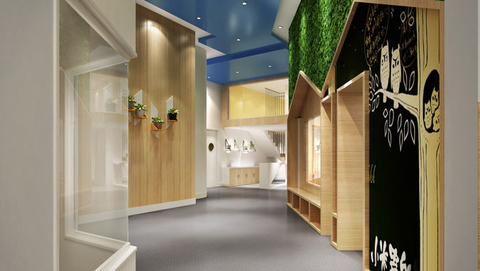 學前教育學校過道設計:灰色的地面、實木的隔墻、綠色的綠植過程了一個自然的空間,在這里孩子們感受到的不是壓力,而是快樂,成長的快樂。
