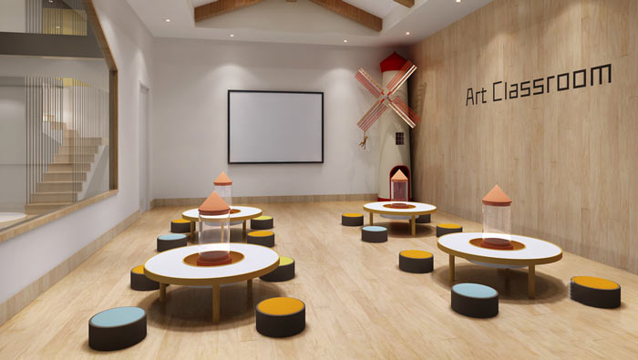 學前教育學校教室設計:孩子們圍著圓形的桌子,在這里聽老師講自己細化的事物,在不斷接觸新事物的同時,孩子們也在不斷的成長、脫變。