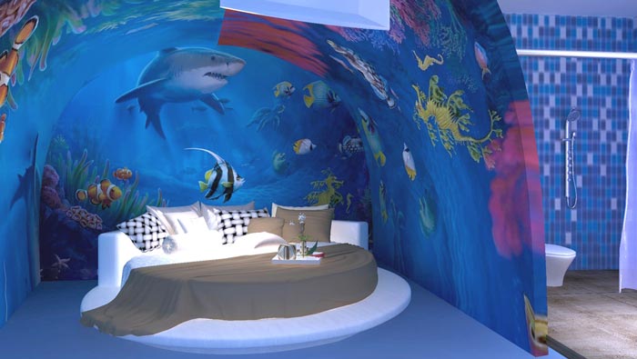 海底客房的設計:在此次戀人們仿佛變成了無憂無慮的魚兒,去探險那未知的海底世界,在這里他們會見到千奇百怪的海底生物,設計師希望讓他們,在這里來一次十分有意義的旅行,以此填補人們對于海底世界的無知,給戀人們一個美好的旅行,屬于兩個人之間的秘密。