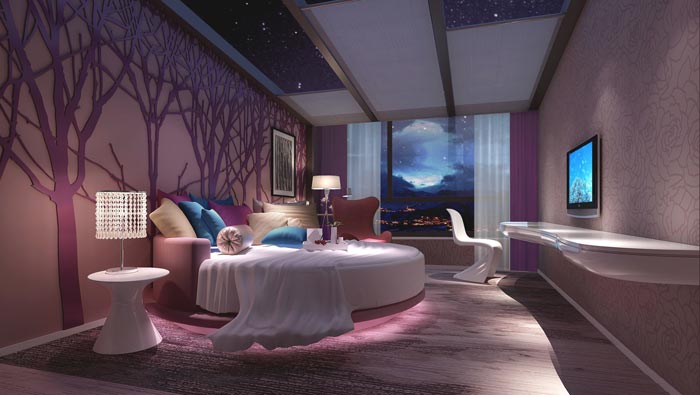 情趣客房的設計:對于客房的設計,設計師也有這很多嘗試,但是設計師不是一味的模仿,而是在設計的同時在其中加入本土化的設計,讓其可以在此處開花結果,設計師認為設計不僅是求新求變,而更多的是對人的尊重,因為設計最終針對的還是人,但是由于文化的不同,其表現方式也截然不同。