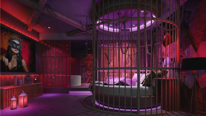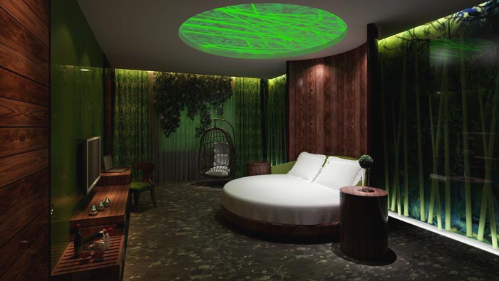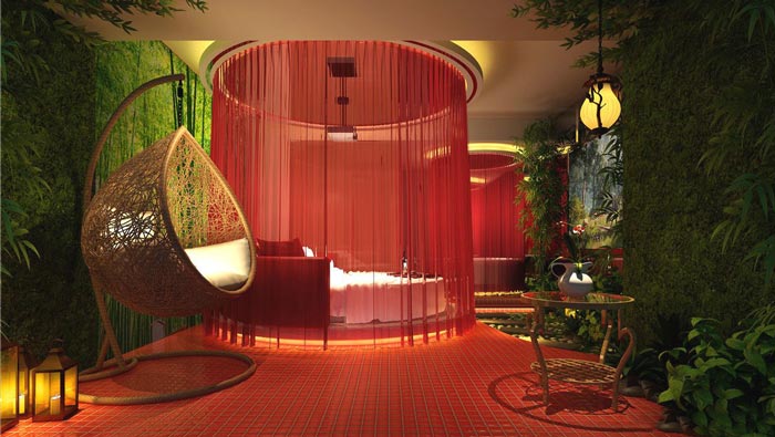 情趣客房的設計:這樣的客房酒店只有2間,主要也是為了嘗試、或者說是試驗,設計師設計的目的也是為了兼具以得,同時設計師也強調這樣的房間不宜過多,由于文化的不同,此處也是在設計師的修改之下完成的,含蓄的美遮蓋住空間原本的含義,讓人更容易接受。