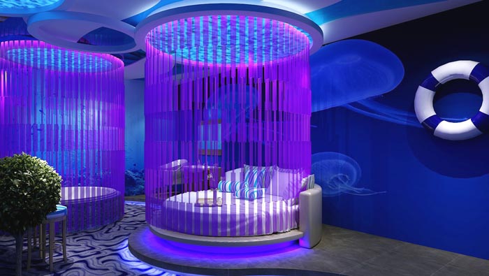夢幻客房的設計:在這里戀人們仿佛來到了一個夢幻的世界,在這里戀人可以度過自己的二人世界,在這里戀人們好似在海底,在海底遨游、在海底觀賞,戀人們相互依偎在一起觀賞者外面的世界,一切都是那么的美好,在這里戀人將度過一個與眾不同的夜晚。