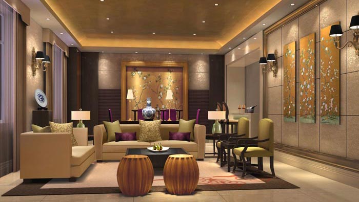 套房客廳的設計:顧客進入空間之后,首先就是坐下來休息一下,讓自己的心平靜下來,相信這是人之常情,此處給客戶的是一種家的溫暖,在設計師看來商務人士,最常有的就是出差,設計師希望讓客戶在外地同樣可以感受到家的溫暖。