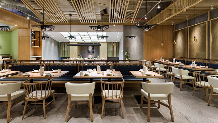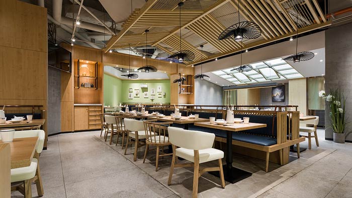 小吃店餐區裝修設計:簡約、精致、柔和的餐區設計,為小吃店營造了不同的就餐氛圍,在這里環境好、美食香,兩兩相加絕不是一加一,而是為傳統的小吃店賦予了全新的生命。