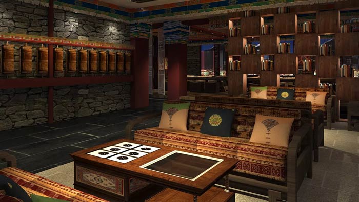 藏式主題餐廳等待區設計:當餐廳爆滿的時候,客戶將在這里等待,客戶可以在這里看看書、聊聊天,以此抵消等待的煩惱,這也是設計師希望看到的。