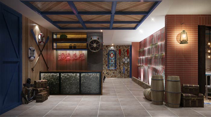 主題餐廳二樓入口設計:海盜往往與寶藏、船、海洋有關,這里給你的是一種回憶、一種文化、或是博君一笑的美好氛圍,多方位感官刺激,將海盜具象在客戶面前。
