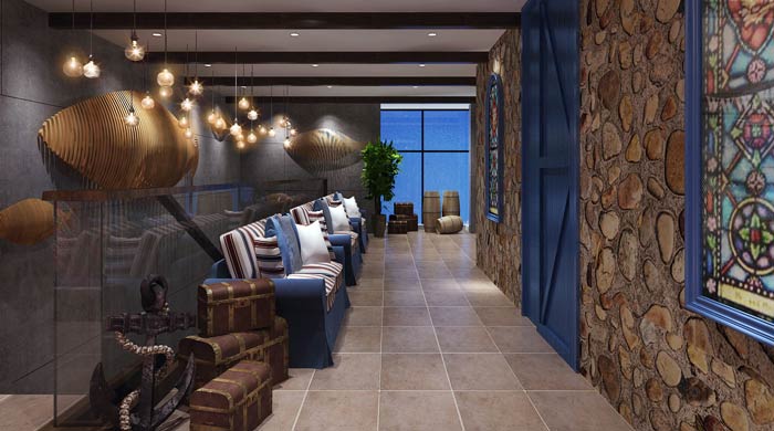 主題餐廳過道休息區設計:逼真的海上場景布置,讓人仿佛回到了航海時期,仿佛徜徉在廣闊的大海中,實木桌椅的設計,讓人感受到最原始的真實。