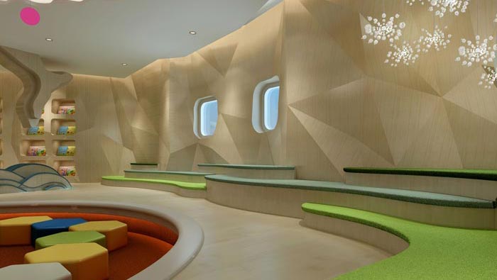 休息區(qū)域的設(shè)計(jì):此處位于空間的一側(cè),設(shè)計(jì)師在設(shè)計(jì)中將其設(shè)計(jì)成階梯式,即增強(qiáng)了空間的容納能力,同時(shí)也充分考慮到孩子的興趣與愛好,對于階梯相信很多孩子都有很大的興趣,或上火下或休息讓孩子自己決定,企業(yè)的目的就是不強(qiáng)加給孩子任何負(fù)擔(dān),培養(yǎng)孩子自主的能力。