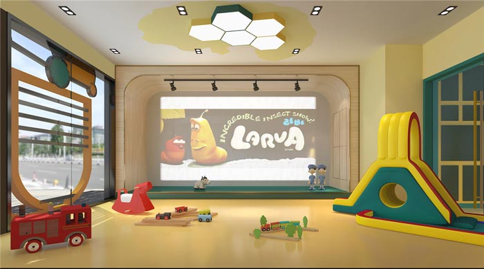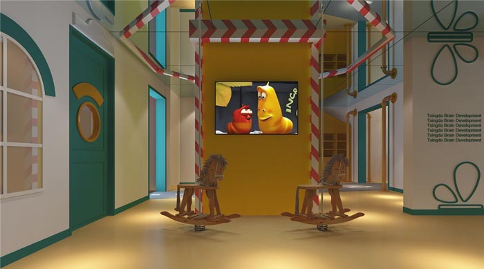 前臺區域的設計:設計師在設計之初,搜索了很多關于早教中心的案例,進行不斷的摸索與分析,同時一個歡快的空間氛圍也十分重要,其中爆笑蟲子的出現,也體現了設計師對于孩子的期待,爆笑蟲子在設計師看來是一部充滿創意與樂趣的動畫,其中融合了音樂、節奏、豐富的肢體動作,以此培養孩子們樂觀向上上、相互陪伴的人生價值觀。
