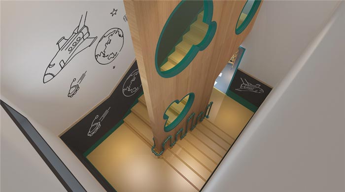 樓梯的設計:此樓梯非彼樓梯,此處樓梯是按照孩子們的比例進行改造的,孩子們可以輕松的上上下下,低于幼兒來說也是一個不錯的區域,孩子們通過不斷的努力不斷前行,最終走上二樓,這本身就是一種訓練,對于設計師來說整個空間都是一個挑戰,讓孩子們不斷地成長。