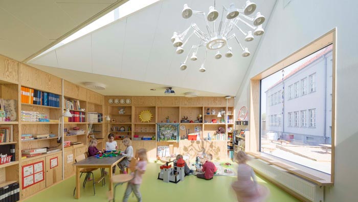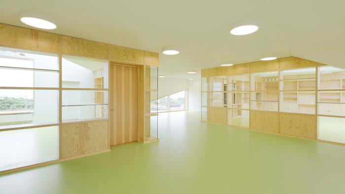 教室內(nèi)部的設(shè)計(jì):內(nèi)部有膠合板制成的“書柜墻”圍繞在空間的四周,與綠色地板一起構(gòu)成了整個(gè)空間的格局,這樣的設(shè)計(jì)為整個(gè)空間創(chuàng)造出,流暢的空間體驗(yàn)和一致性和透明度,讓孩子們?cè)谶@里成長、在這里積累知識(shí)、在這里見證自己的童年。