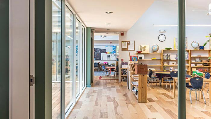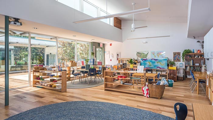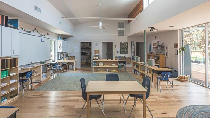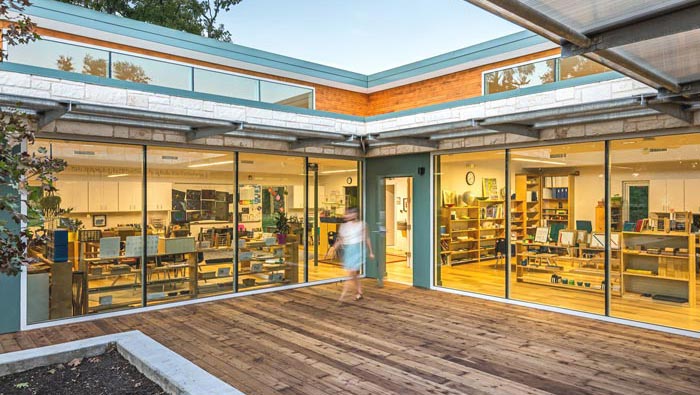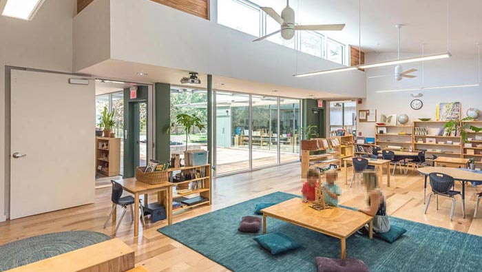 教學(xué)區(qū)域的設(shè)計(jì):細(xì)細(xì)看去空間給我們的感覺是那么的自然,這也是設(shè)計(jì)師希望得到的設(shè)計(jì)氛圍,在設(shè)計(jì)師看來內(nèi)部表現(xiàn)出室內(nèi)的氣候循環(huán),也更能讓孩子們喜歡這里,通過調(diào)查孩子們喜歡的戶外,因?yàn)樵趹敉夂⒆觽兛梢詿o憂無慮,此處就是結(jié)合孩子的天性,讓孩子們喜歡這里、愛上這里。